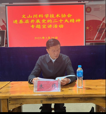 3月28日上午,州科协深入乡村振兴挂联点西畴县西洒镇英代村委会开展党的二十大精神宣讲暨普法强基补短板宣传活动。会议由西洒镇组织委员侯隐砥主持,州科协党组成员、副主席朱伟做专题宣讲,西畴县科协干部职工、英代村委会党员同志近20人参加了此次学习。