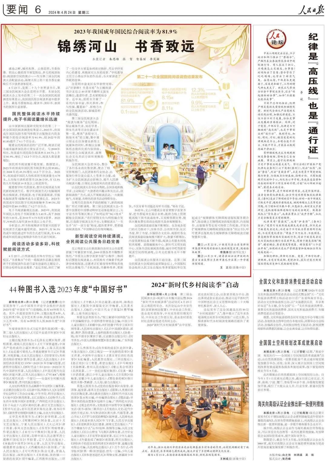 4月22日,江西省南昌市珠市学校云飞路校区,“书香集市”中的一场阅读作品静态展将孩子们的阅读作品进行富有创意的主题设计,引得全校师生驻足观看。“走近苏轼,我们了解了一位文学大家是如何面对挫折、用文学抒发内心的感受、积极面对人生的故事。”学校教导主任万小燕在学生的作品前,为大家讲述了苏轼的故事。在昆明市盘龙区东华农贸市场,以“好新鲜!书菜市场”为主题的读书沙龙设立40余家书籍和文旅生活摊位,邀请作者、艺术家现场分享。近年来,昆明市开展了一系列内容丰富、形式多样,参与性强、覆盖面广、影响力大的全民阅读活动,春城昆明书香四溢。第三届全民阅读大会“阅读与媒体”论坛现场,报业媒体代表、知名学者、师生代表等百余位嘉宾齐聚一堂,聚焦“读报学习、拥抱未来”的主题,集中展示报业在自身建设新型主流媒体的同时,积极以全媒体形态提供优质内容供给,在培育公众阅读风尚、凝聚社会文化共识方面所发挥的积极作用。全民阅读大会的举办,整合了各行各业的优势资源,聚合了相关管理部门、人民团体和行业协会、出版发行单位及公益人士等多方力量,成为扩大全民阅读活动影响力、提升人民群众阅读兴趣、引领社会阅读风尚的重要活动。以全民阅读大会举办为契机,全国各地积极寻求、主动贴近广大读者的兴趣点和关注点,创新阅读推广方式,深入开展阅读活动,一大批接地气、有新意、有特色的读书活动持续举办。在现代信息技术手段的赋能下,新的阅读推广形式不断涌现。第三届全民阅读大会·书香中国展的中国移动咪咕互动体验展台上,元宇宙书房等展区展示了如何运用“5G+技术”赋能全民阅读。“我们坚持文化与科技融合发展,打造数字阅读文化平台,支撑阅读从‘一书在手’向‘一屏万卷’转变,提供更多样、更便捷的阅读选择。”中国移动总经理何飚说。