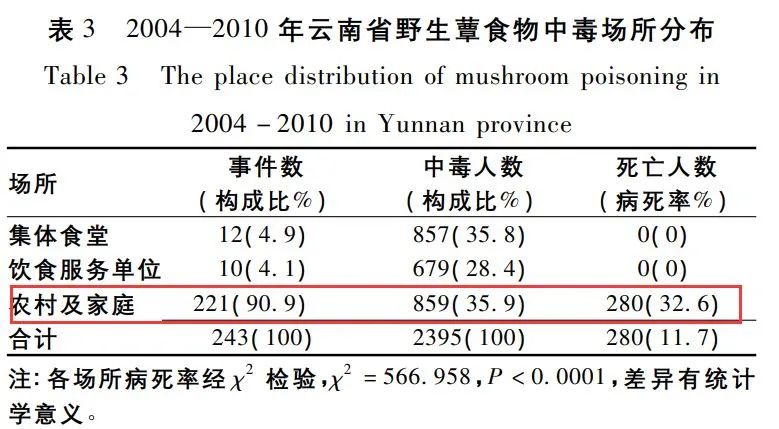 从2004年到2010年期间,云南省野生菌中毒的情况,从比例上看,集体食堂、饮食服务单位和农村及家庭中毒人数基本上是1:1:1,但是死亡人数呢?全部集中在了农村和家庭。