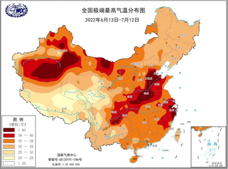 2022年6月13日至7月12日全国极端最高气温分布,图片来源:国家气候中心