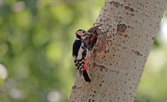 一只大斑啄木鸟觅食后回到树洞,准备喂养雏鸟。新华社记者杨青摄