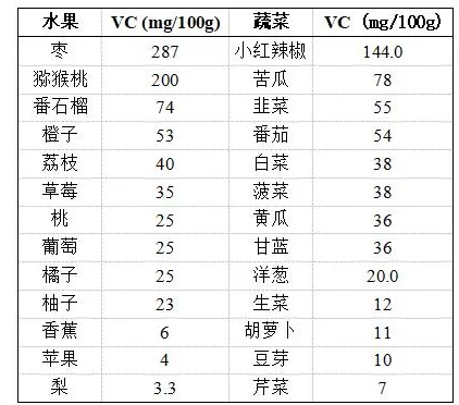 维C的主要来源是新鲜蔬菜和水果,一般叶菜类蔬菜比根茎类蔬菜含量多,常见的水果蔬菜维C含量可以参考下表。