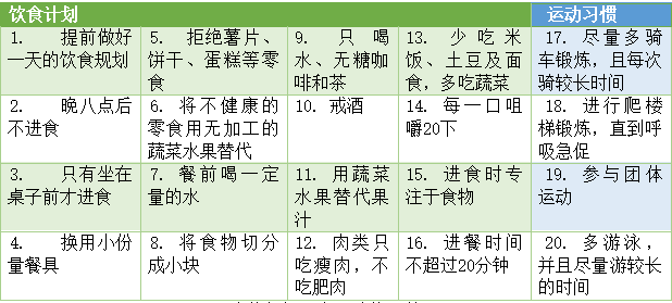 研究人员对于实验的结果感到十分惊讶,因为根据下表中截取的习惯改变建议可以看出,建议中没有哪一项是十分创新且要求严格的,都是日常生活中我们熟知的,并且通过坚持就能有所收获的习惯。