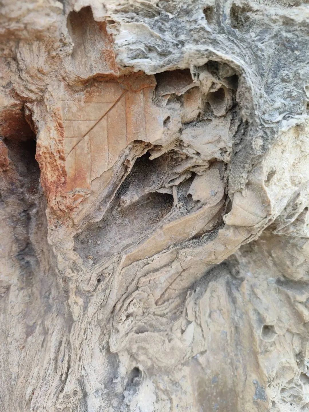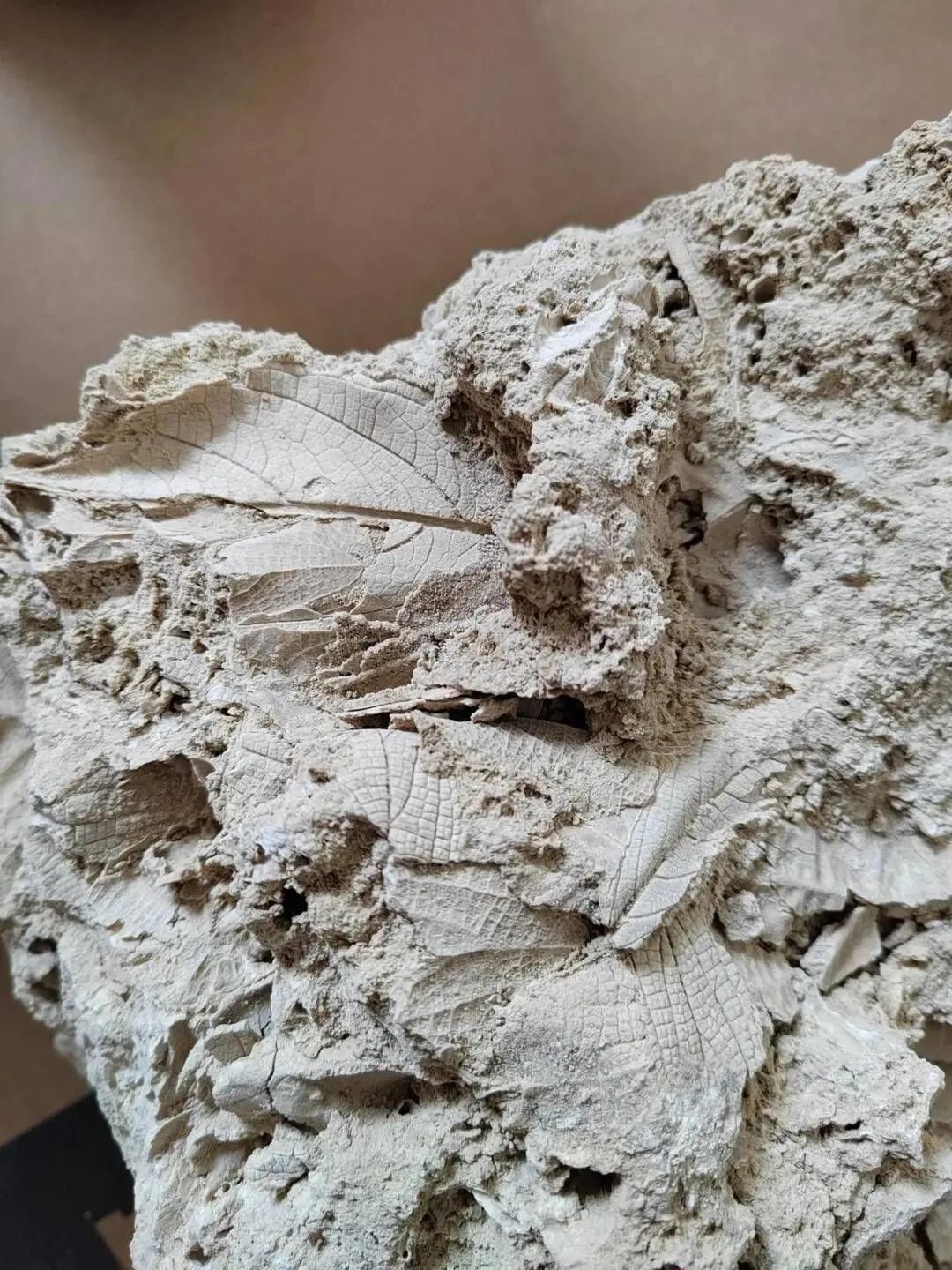 卢娜告诉记者,2024年1月寒假的一天,她带五年级的儿子到八嘎乡三星村做客,在村子里,儿子看到村民们用来砌围墙的石头形状十分奇特,与其他地方的寻常石头不一样。这些石头大小不一,形状不规则,表面也不平整,上面布满了树纹状的孔隙。儿子被这些形状奇特的石头深深吸引,经他仔细观察,还在一些石头上发现了“小叶子”形状的印迹。