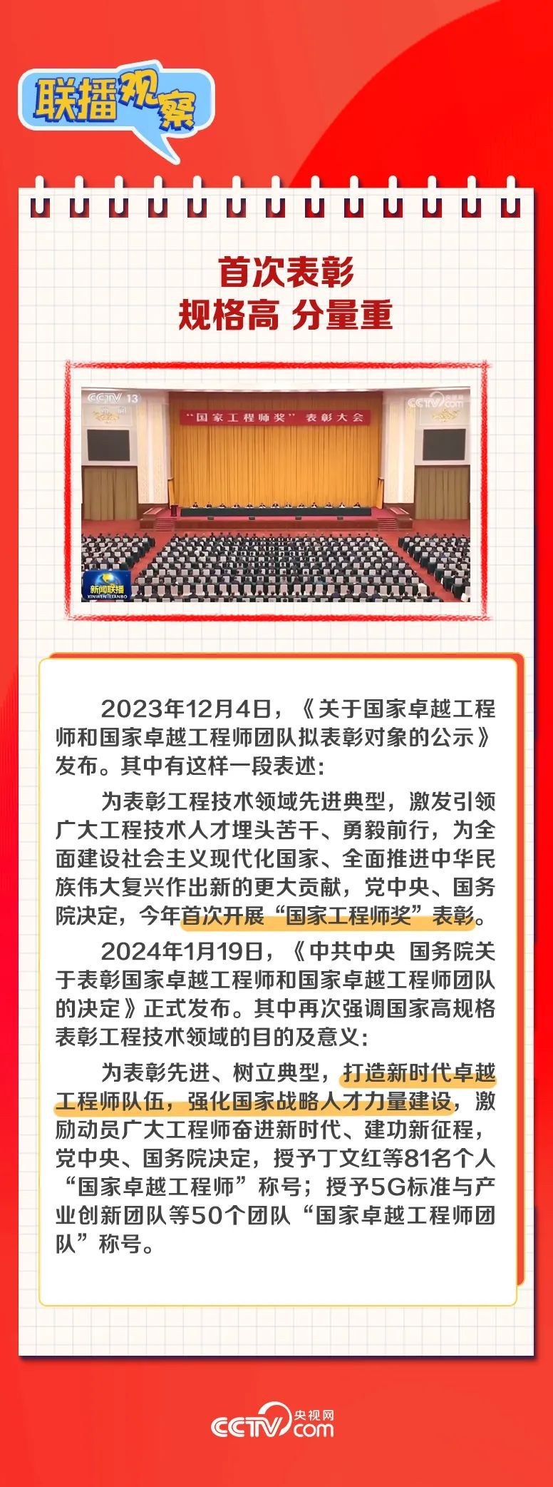 在“国家工程师奖”首次评选表彰之际,习近平总书记专门作出重要指示,向受表彰的“国家卓越工程师”和“国家卓越工程师团队”致以热烈祝贺。