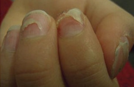 另外,有部分手足口病(柯萨奇病毒 A6 型)会在患病后 1-3 周出现手掌和足底皮肤脱屑,1~2 月出现甲营养不良,例如甲板横嵴(博氏线)或者甲脱落(脱甲症)。